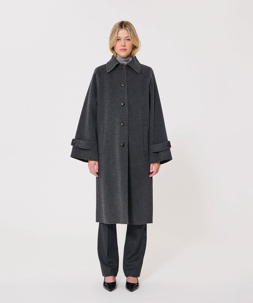 落ち感のあるシルエットが特徴のダブルフェイスコートをステンカラー仕様で着用