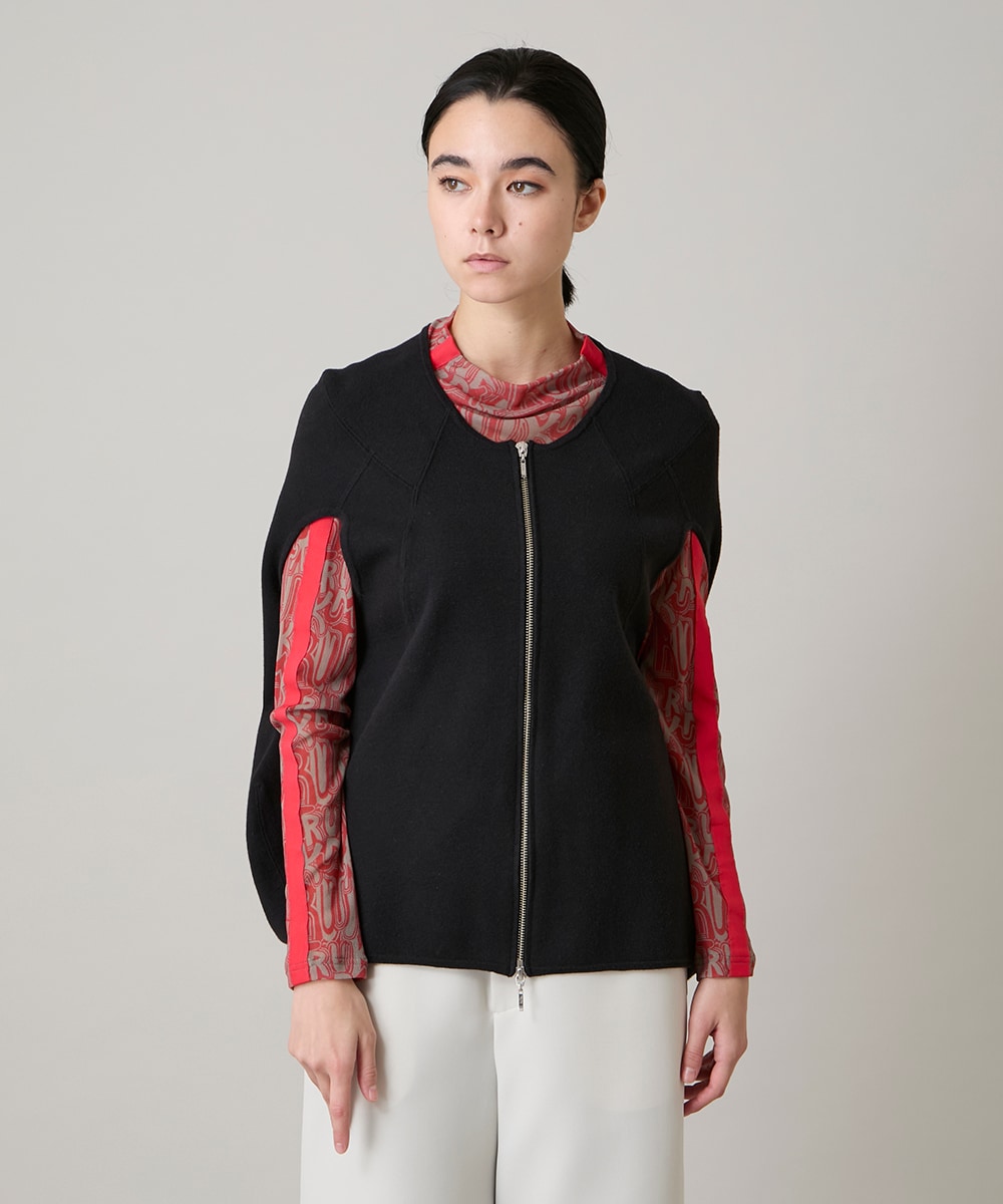 丸みのある立体的なシルエットが特徴のニットベストです。柔らかい肌触りで優しく包み込まれたような着心地です。しっかりとした編地で適度に厚さもあり保温性抜群です。ダブルジップで開き具合を調節することにより、シルエットの変化を楽しめます。