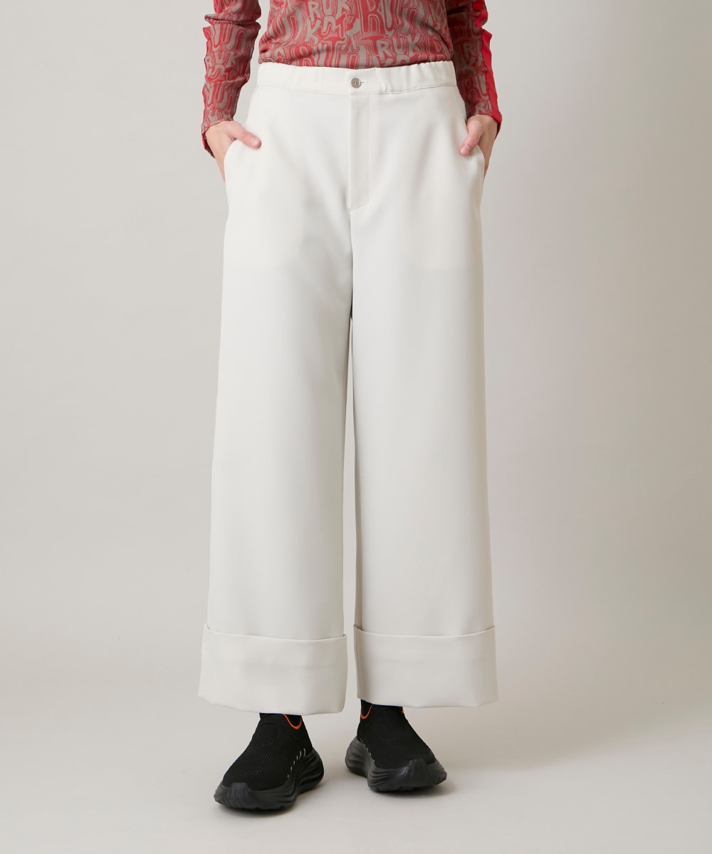 冬に嬉しい、静電気が起きにくい素材のパンツです。脚のラインを拾わないストレートパンツです。裾のダブルを太巾に取った立体感のあるシルエットです。落ち感もあり楽な着心地です。