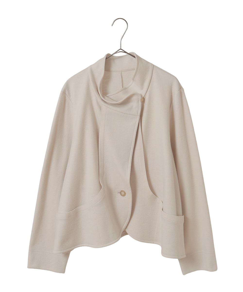 ナチュラルなウールの質感のジャケットです。衿元が特徴でボタンを留めてスタンド