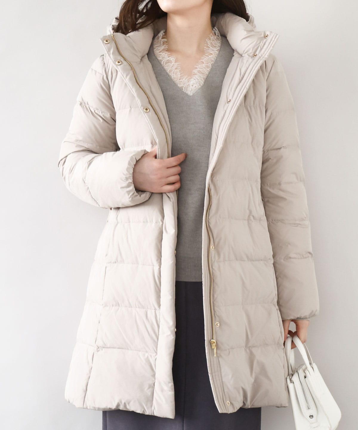 さらに、ベルト付きスムースタフタロングダウンは、女性らしいシルエットを追求したデザインで、付属のベルトでウエストマーク。