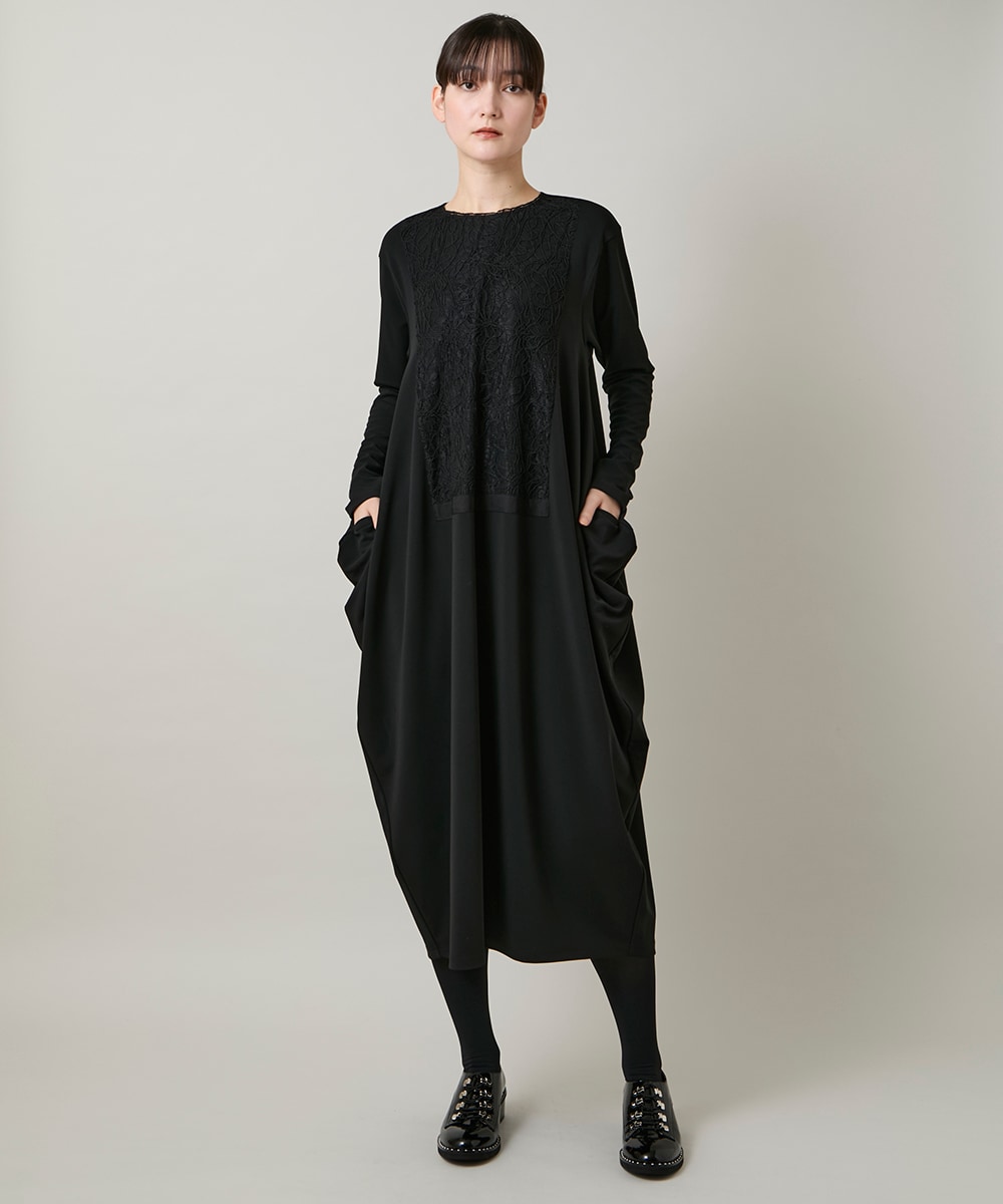 洗練された大人の魅力を引き立てるフロントレースデザインシルエットワンピースは、伸縮性に優れたポンチ素材で着心地も抜群。