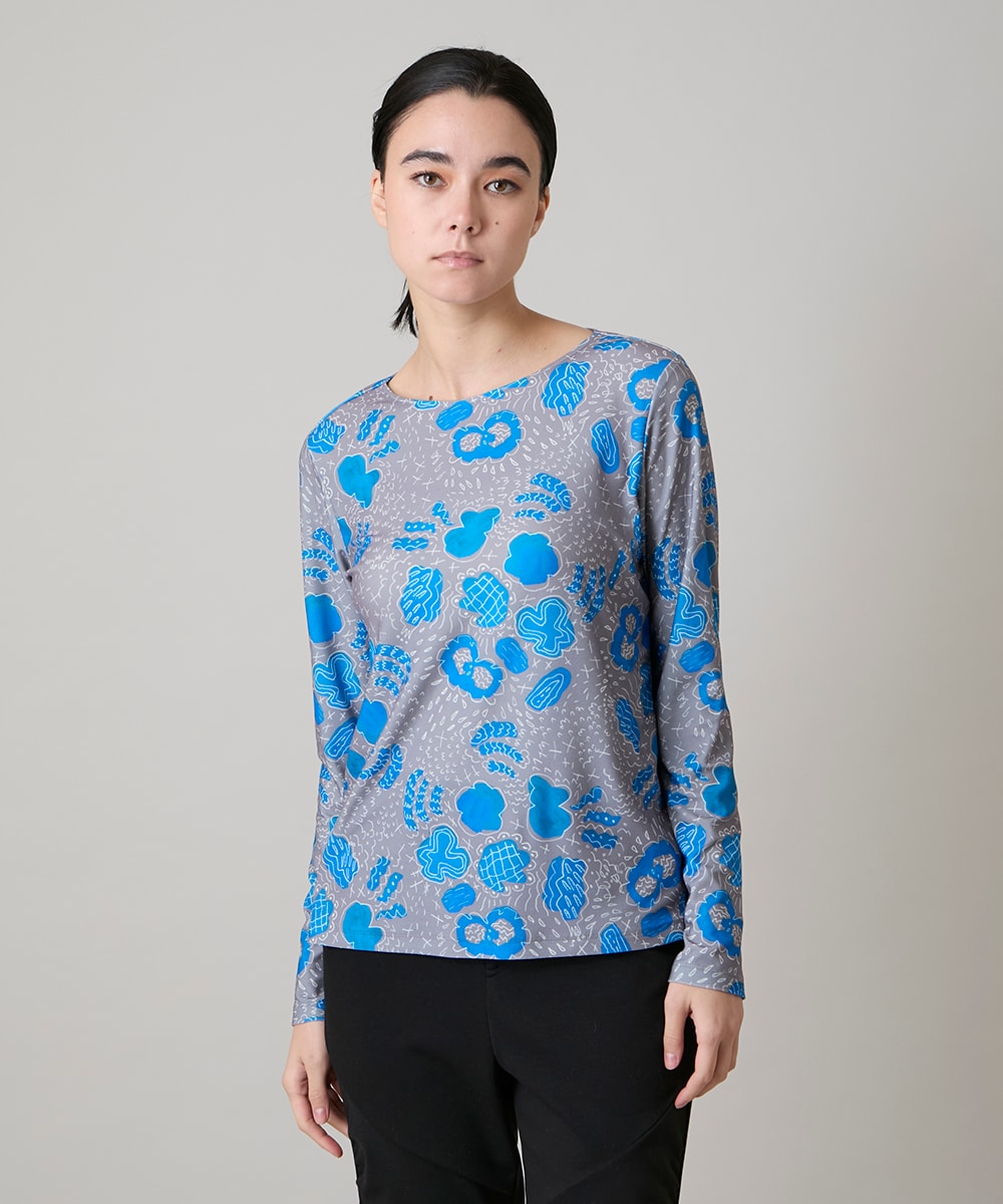 ブルーの柄が目を引くアブストラクトパターンデザインカットソーは、有機的モチーフのプリントが個性を演出し、着心地も快適です。少し肉厚で暖かく、これからの季節にちょうど良いインナーです。
