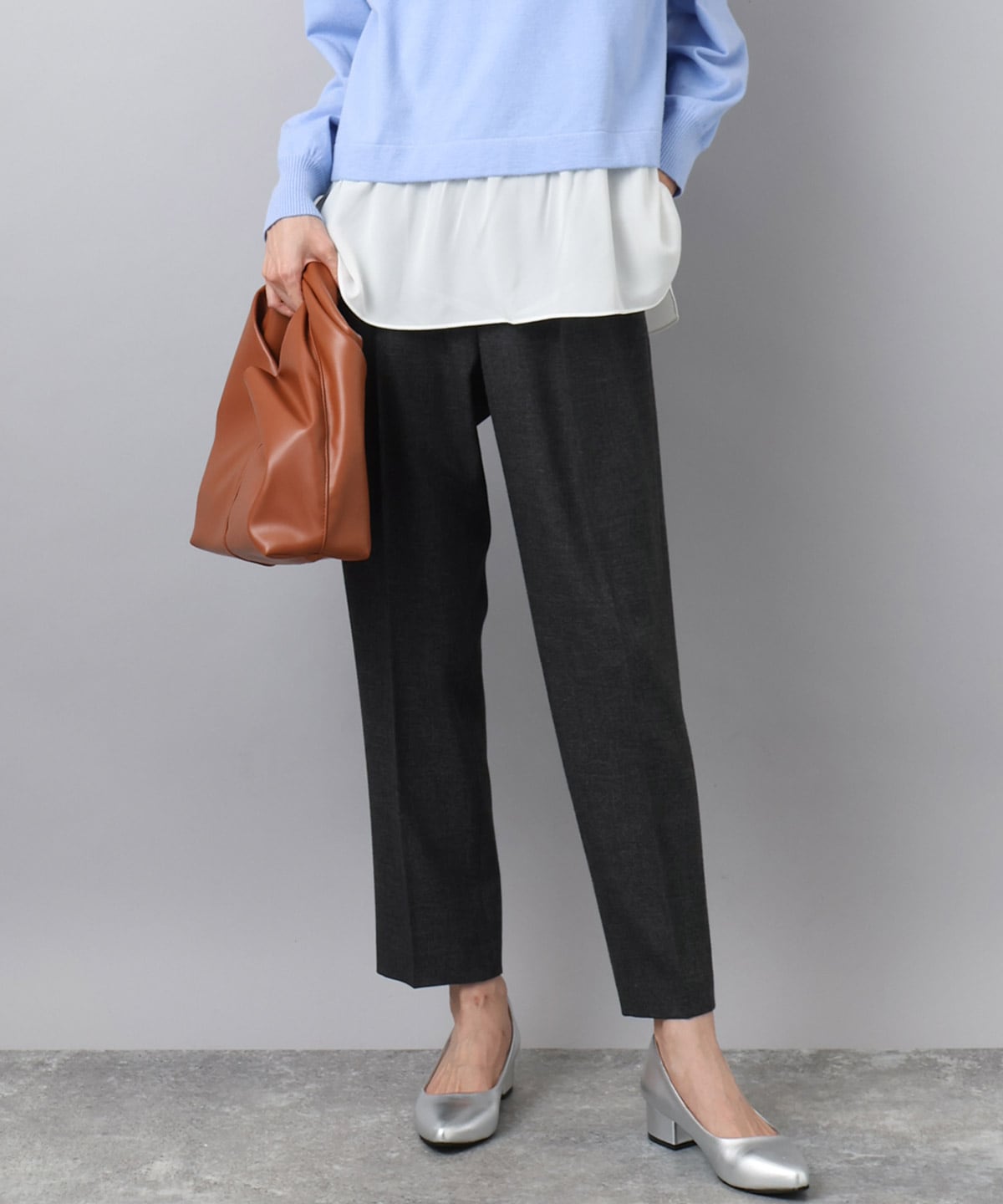 シンプルな美脚シルエットのテーパードパンツです。きれいめに着こなしやすい無地見えするツイード調の柄が新鮮な一枚でお仕事着にもピッタリです。
