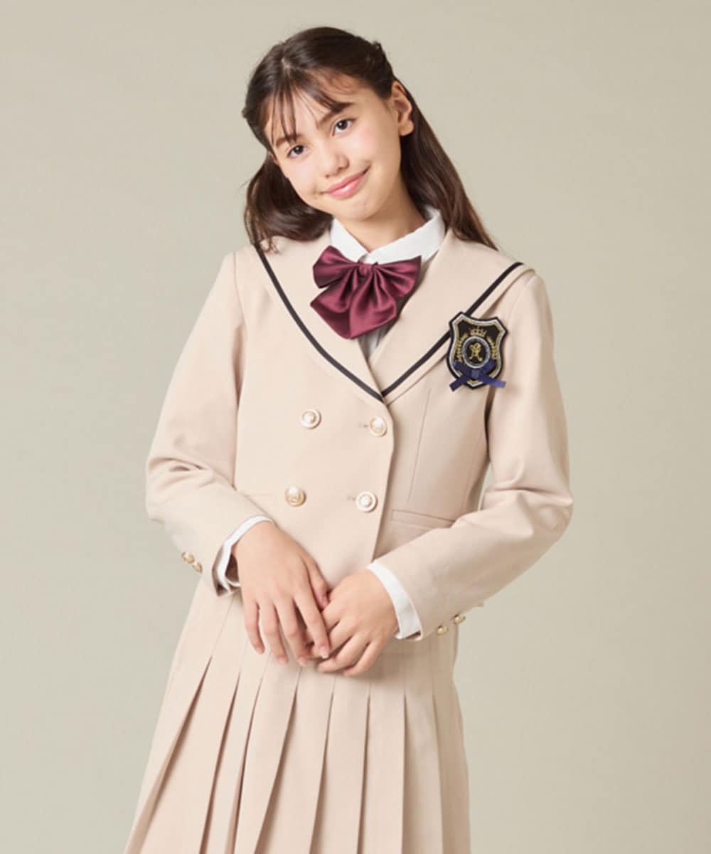 シンプルだけど華やかで、卒服としてピッタリなスカートです。同素材ジャケットの(KQJBD04099)衿の配色ラインとスカートの裾ラインがリンクして、写真映えする卒服コーデに。