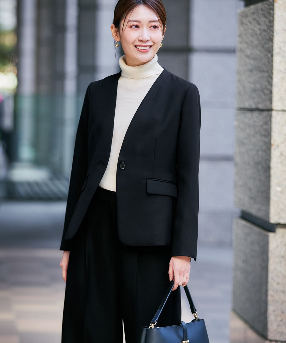 程よい立ち上がりのハイネックは窮屈感のない着心地
