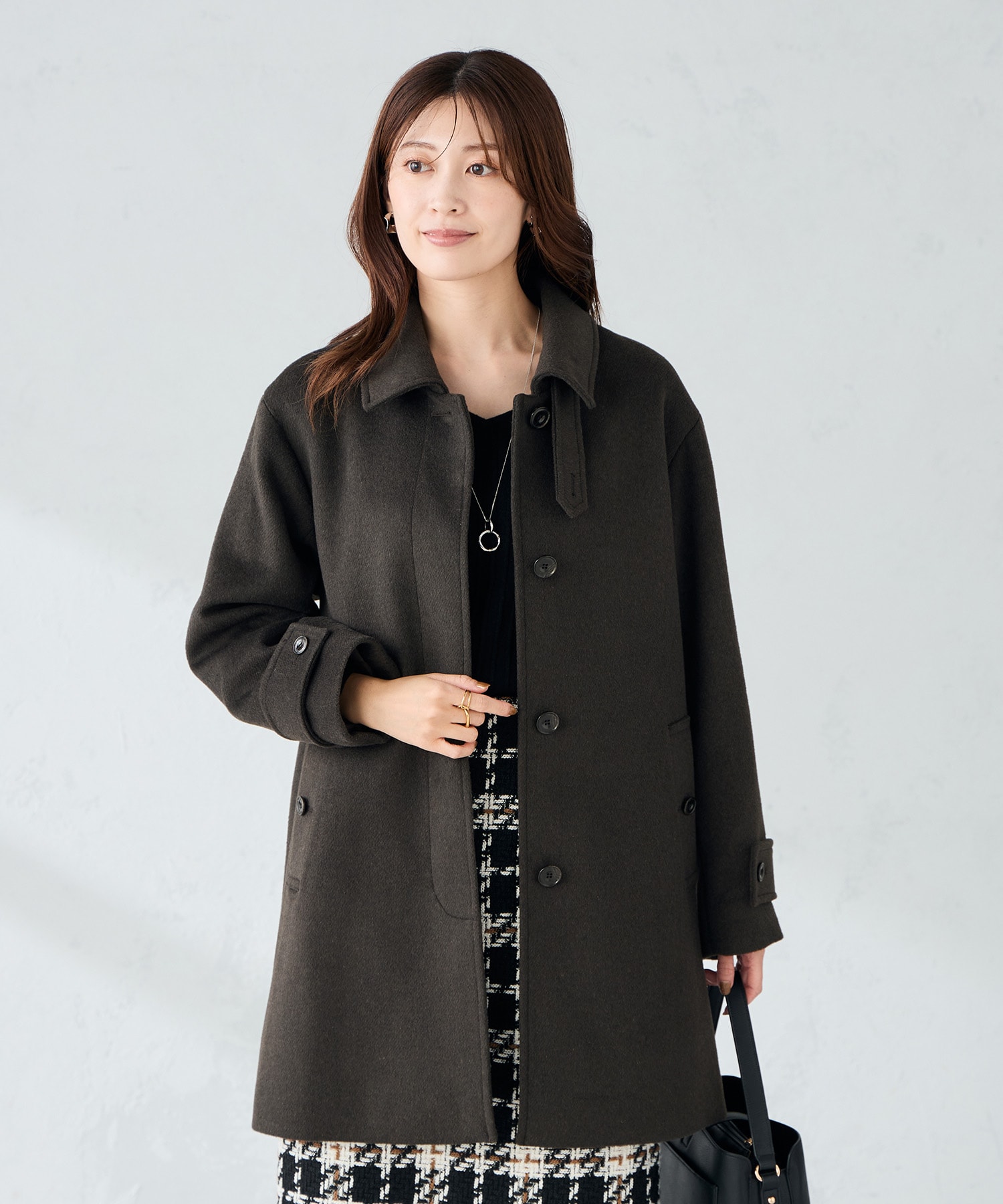 ミドル丈のAラインシルエットで女性らしい印象のステンカラーコート