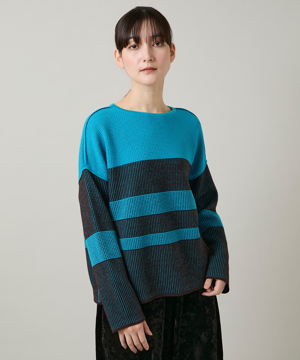 カジュアルなボーダーニットは、柔らかなウール素材と立体的なポコポコ柄で、シンプルながらも存在感抜群です。体型カバーに優れたデザインで、二の腕のラインをさりげなく隠しながら、きれいめスタイルに仕上げます。