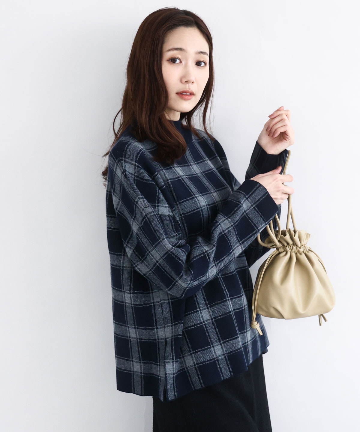 しっかりとした肉感で暖かく、ソフトな肌あたりが優しいニット。ゆとりがあるデザインですがチェック柄が縦ラインを強調してスッキリ見せてくれます!単品でも着まわしやすく、スカートと合わせるとイベントごとにも最適な一枚です!
