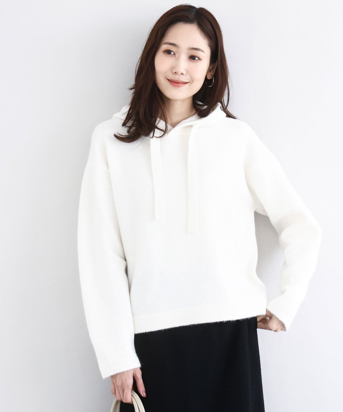 大人カジュアルスタイルにおすすめなニットフーディです。