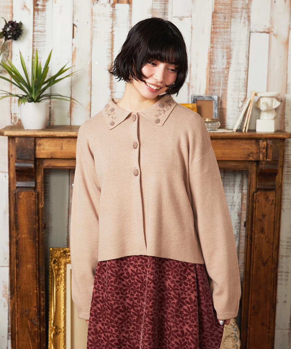 カーディガンは、襟の刺繍とビーズがポイント。シンプルながらも華やかな一枚。ワンピースとの相性も◯です。