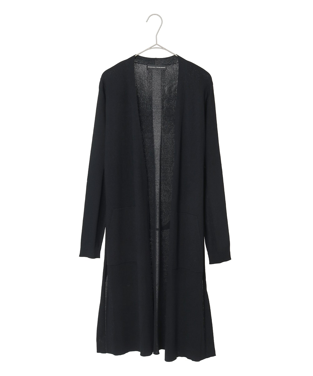羽織っているのは、定番のロングカーディガン。一枚羽織るだけでスッキリ見えるので、人気のカーディガンです。ロングカーディガンですがサイドスリットが入っているので、動きやすくパンツにもスカートにも合わせていただきやすくて、シーズンレスで着ていただけるのでとても便利なカーディガンです。