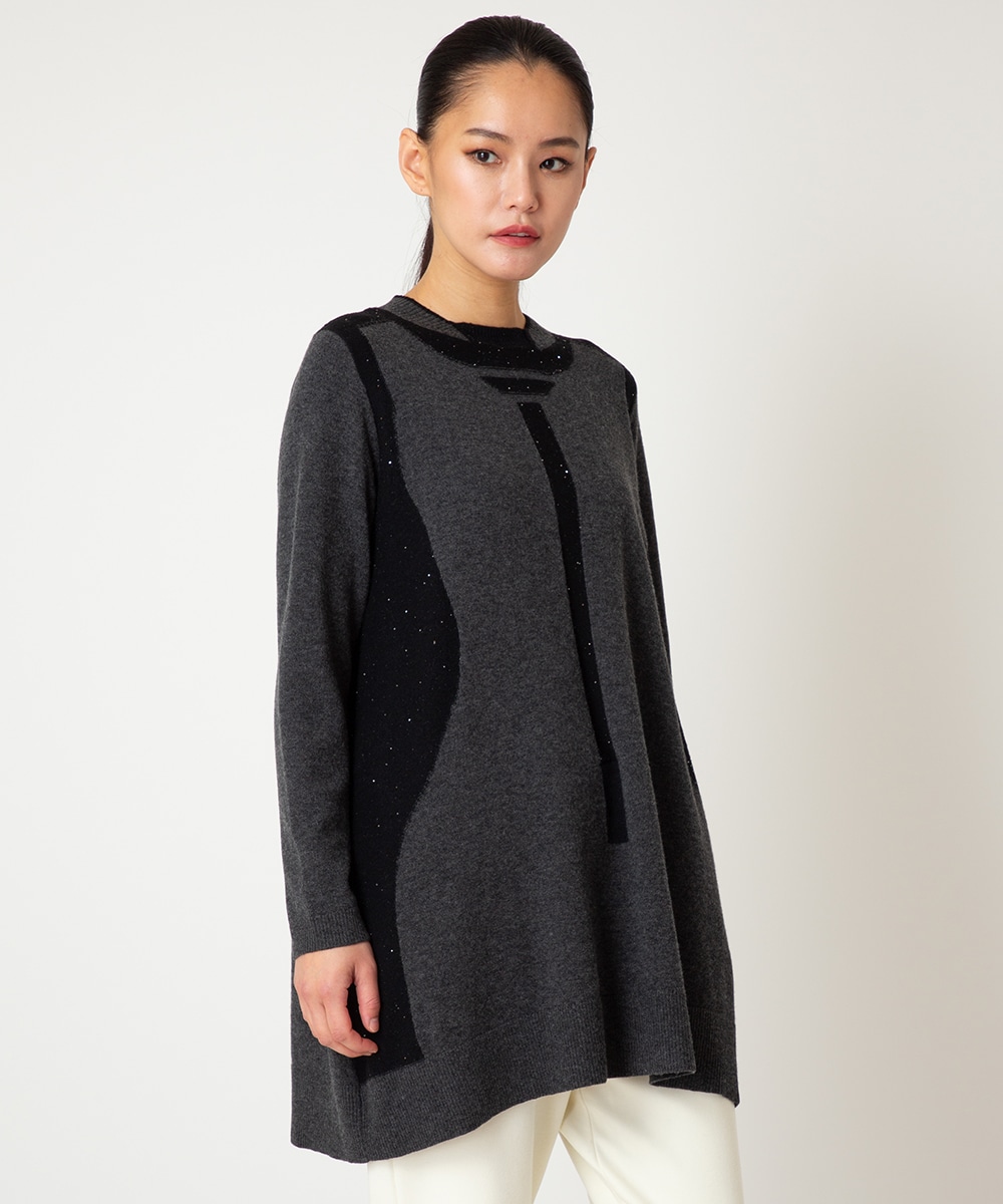 配色切り替えスパンコールニットチュニックは、ウールをベースにしたふっくらとした手触りとさり気ない光沢感がポイントです。