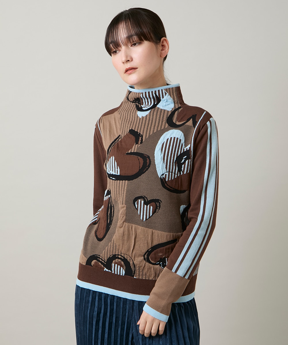 トップスはコットン100の膨れジャガードニット。オフ気味なハイネックは首元すっきり見せ、ハート柄部分の糸が盛り上がった立体感ある膨れジャガードが存在感ある細番手糸のニットです。コットン100の空気を含んだ暖かさと通気性良く快適な着心地にくわえ、厚みが然程ない為インナーにも一枚着にも活躍し、冬から春先まで着ていただけます