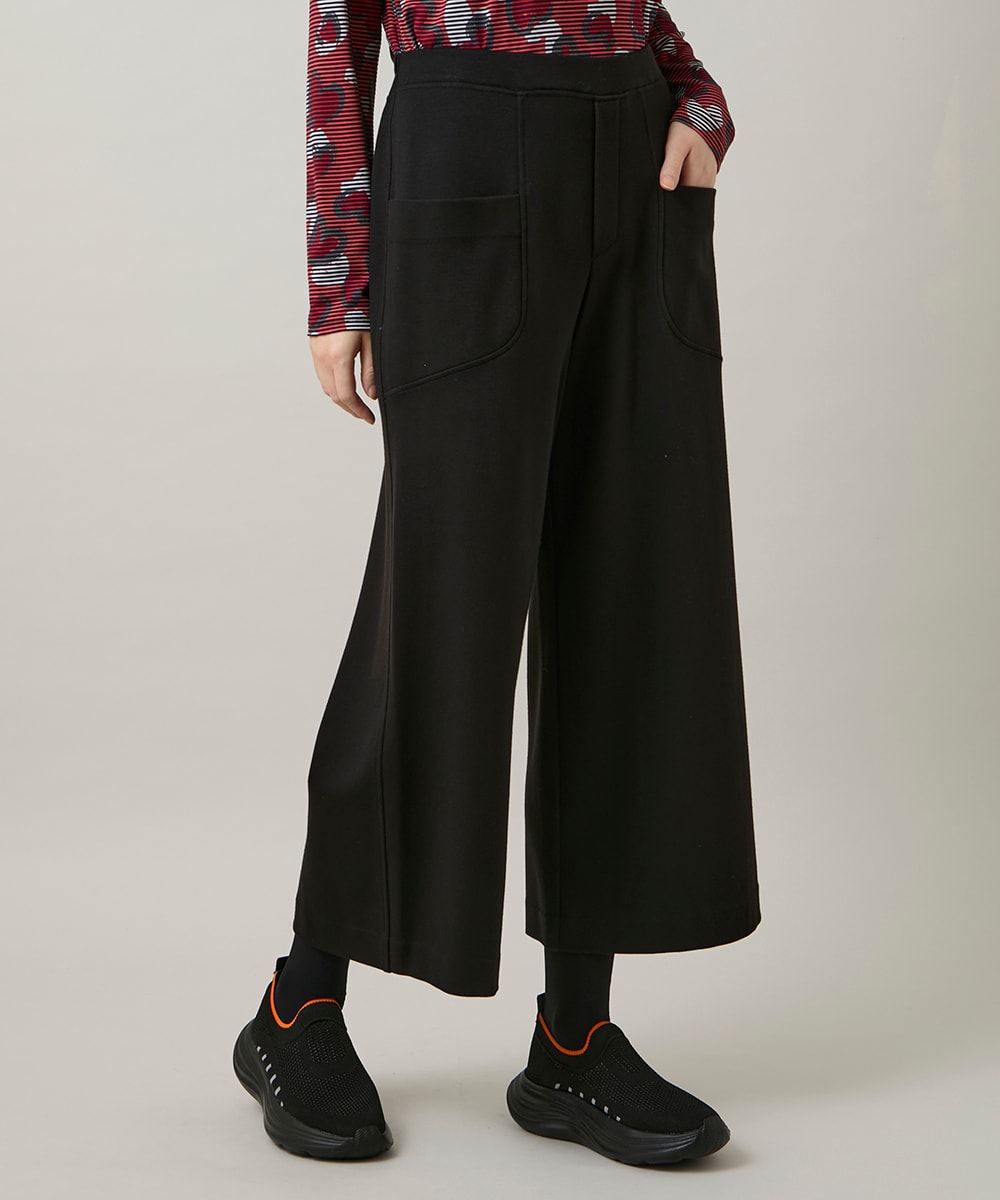 パンツはハイテンションで滑らかなウォームポンチ素材の程よい太さとスッキリ見えするシルエットの暖かさとストレスフリーを兼ね備えたパンツ。ウエストも総ゴムでくるぶし丈ですが身長によってはフルレングスでも綺麗に履いていただけます。