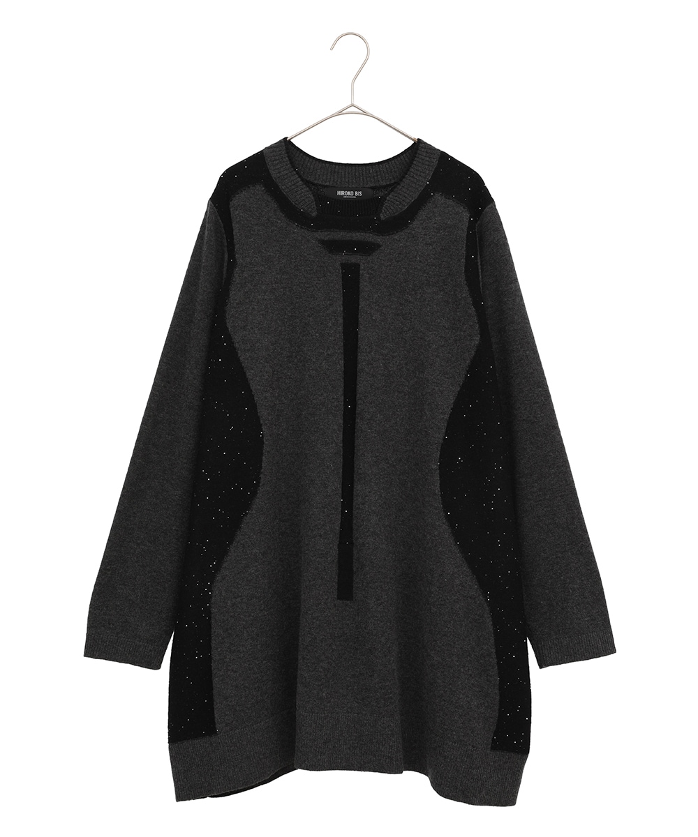 配色切り替えスパンコールニットチュニックは、ウールベースのふっくらとした手触りと、さり気ない光沢のスパンコールが大人の上品さを演出。