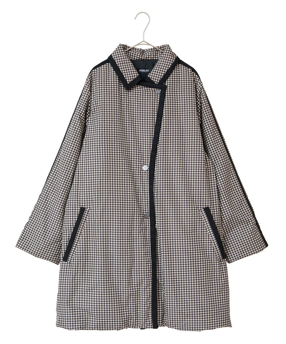 千鳥プリントのダウンは薄手ながらも暖かさをキープし、着ぶくれ感なくおしゃれを楽しめます。配色のグログランのアクセントがすっきり感ある見え方に。