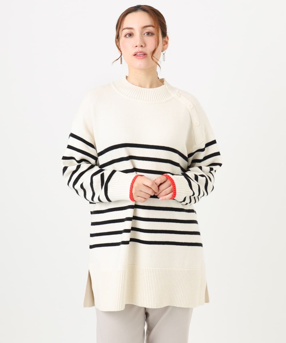 ボタン使いの襟ぐりがかわいいボーダーニット。