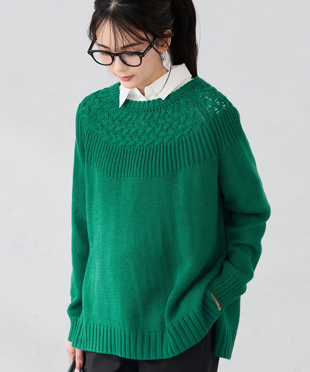 アウターが暗い物が多い方にはオススメのグリーンニット。