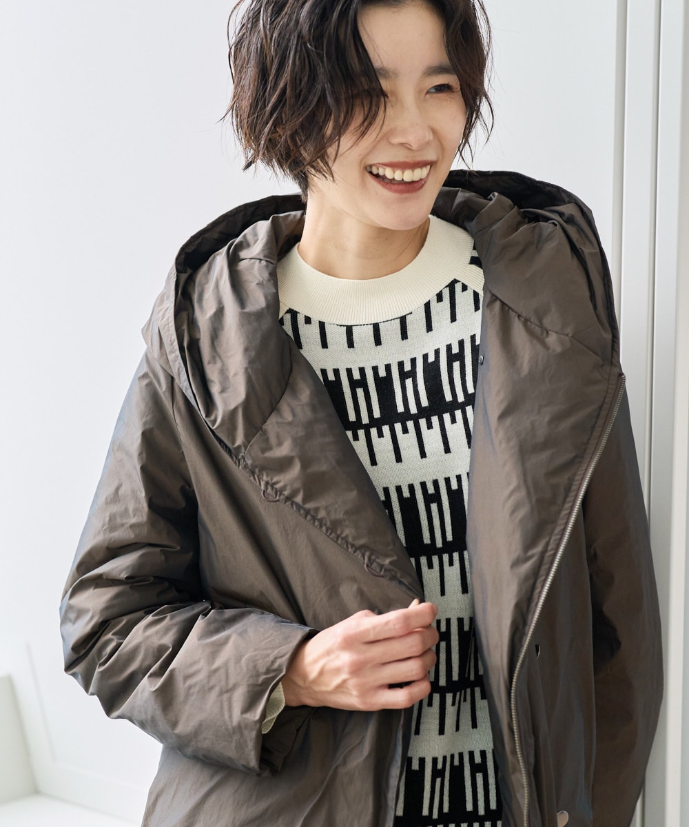 玉虫色の光沢が大人の魅力を際立たせてくれるダウンコートです。