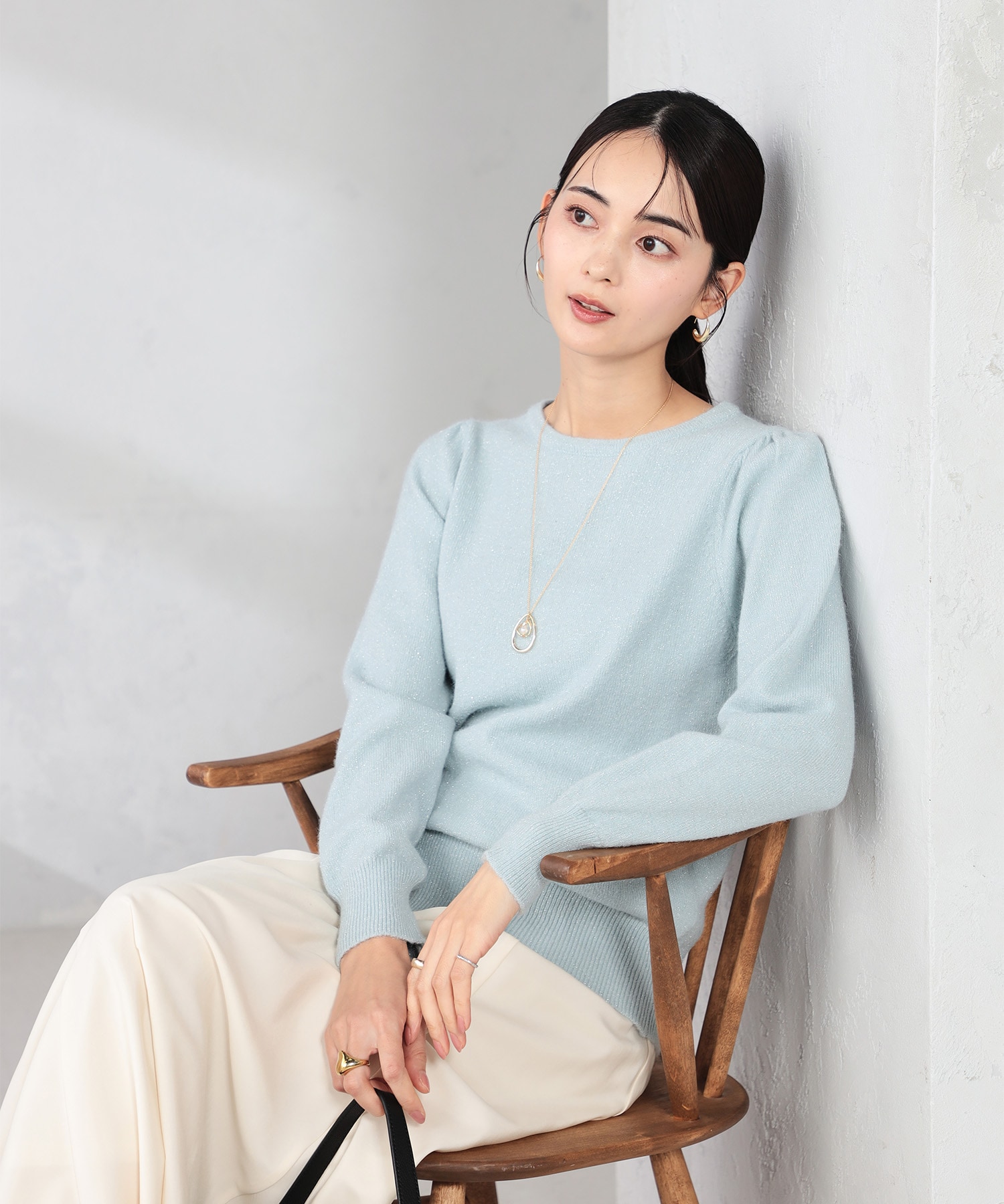 ニットは、パフスリーブデザインで、程よいラメ感があり、上品な印象で着ていただけます。