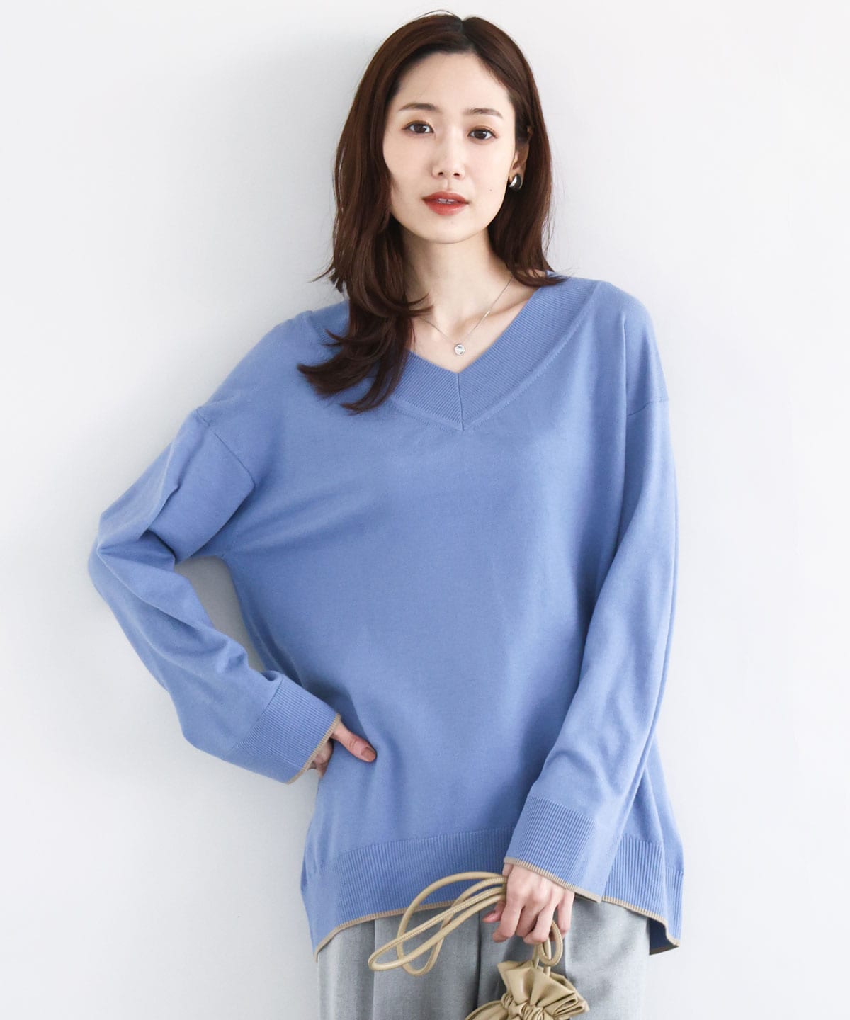 衿元は幅広なリブのVネックラインでデコルテを綺麗に見せてくれて上品さを引き立てます。
