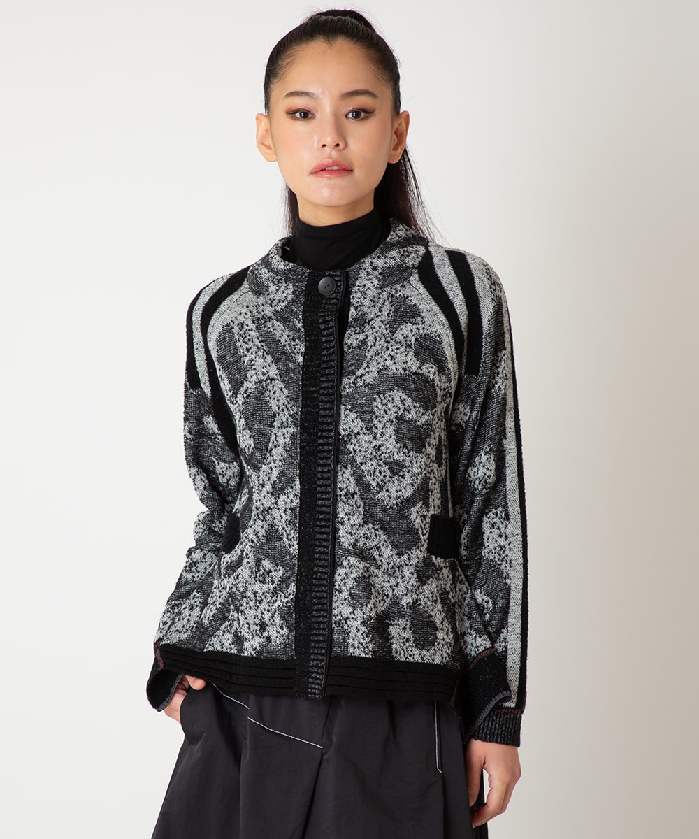 ロゴジャカードニットカーディガンは三種の糸を使った巧みな編みディテールと遊び心ある