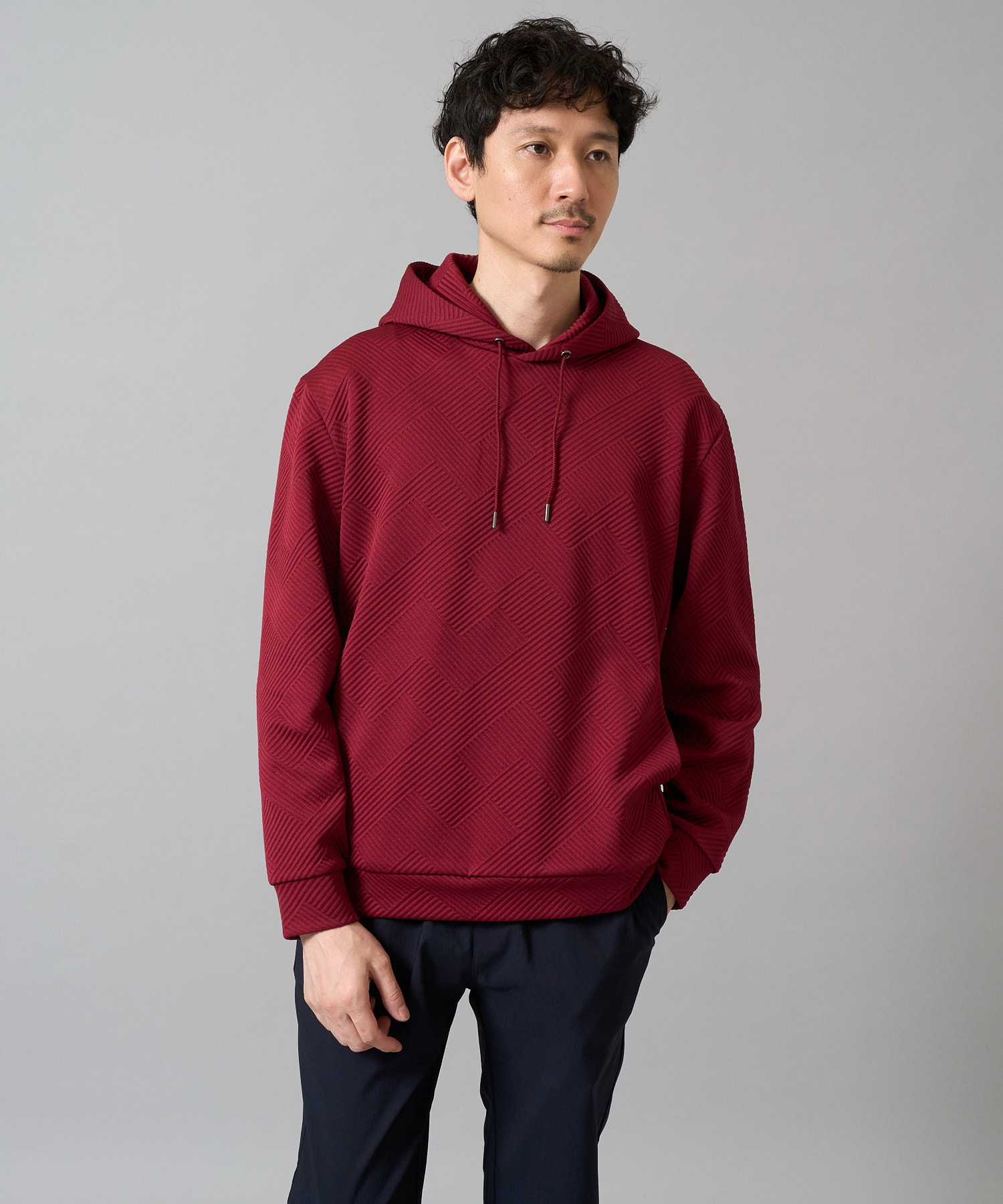 深めの赤が大人の落ち着きを演出するスッキリ見えするパーカーは、幾何ジャカード素材の上品な表面感で、トレンド感と高級感を兼ね備えています。