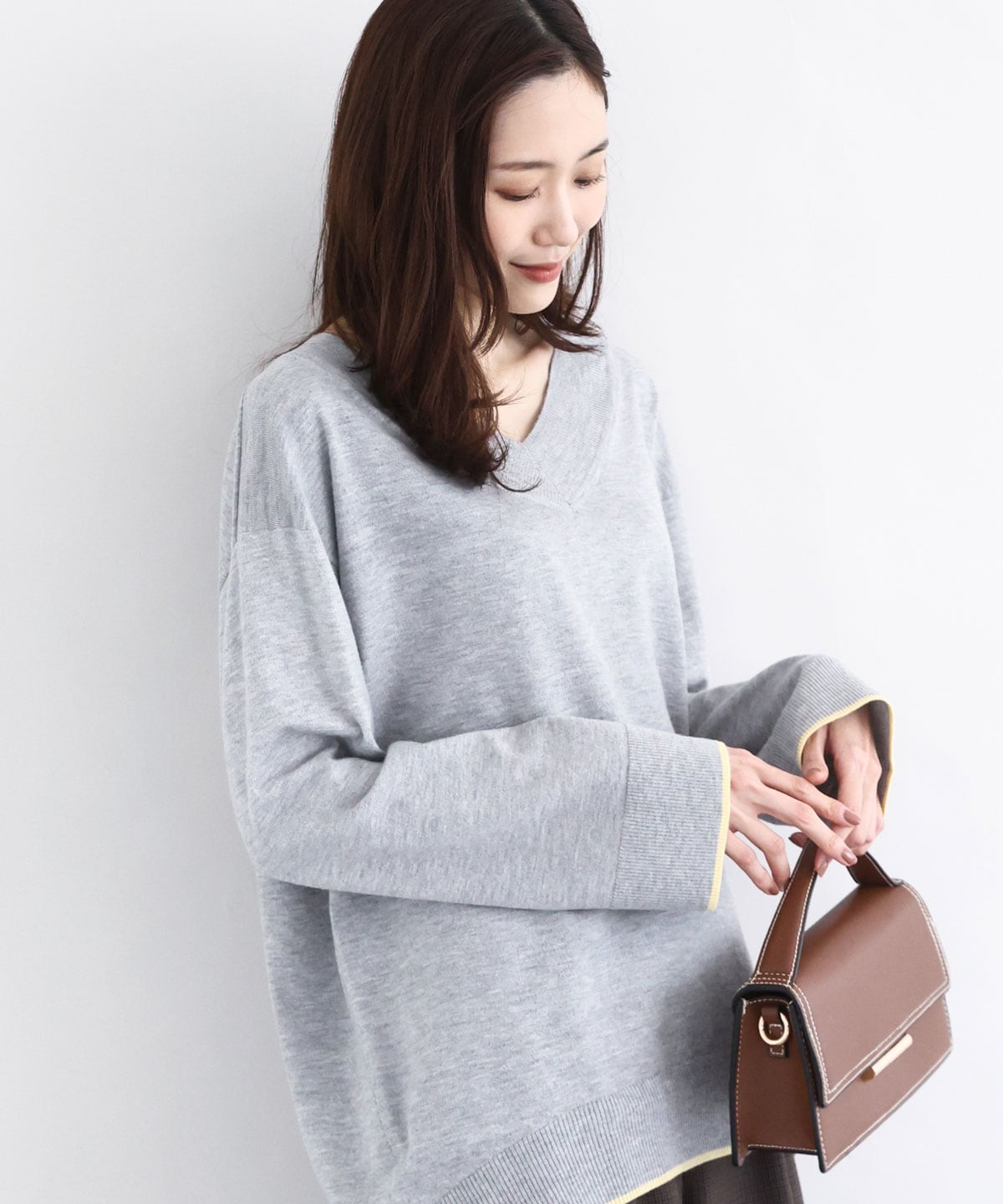 配色ライン入りのVネックニットは、ゆったりシルエットで腕太めやバスト大きめの方もラクに着られ、裾や袖口のアクセントが女性らしい華やかさを演出。