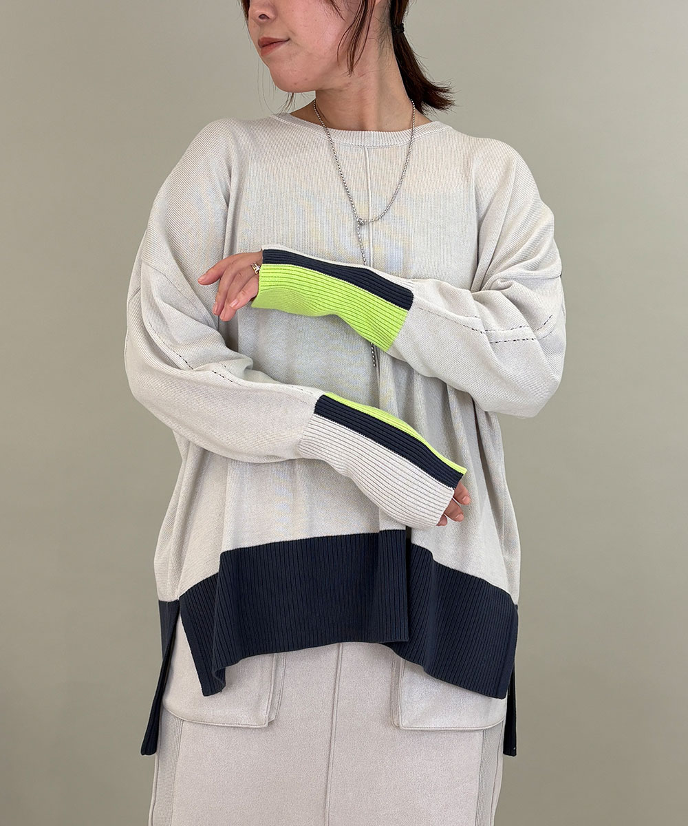 ショルダーラインや袖口、裾のリブ部分には差し色のアクセント。