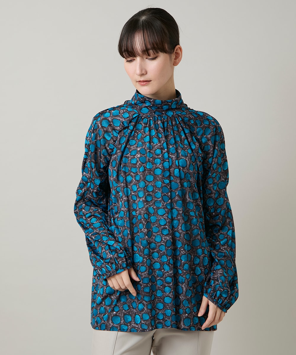 たっぷりのギャザーが大人フェミニンなデザイン、甘くなりすぎないようにハイネックの襟にしています。やや長めの着丈が縦のラインをきれいに見せます。一枚着でもジャケットやカーディガンを羽織ってインナーにも最適なアイテムです。