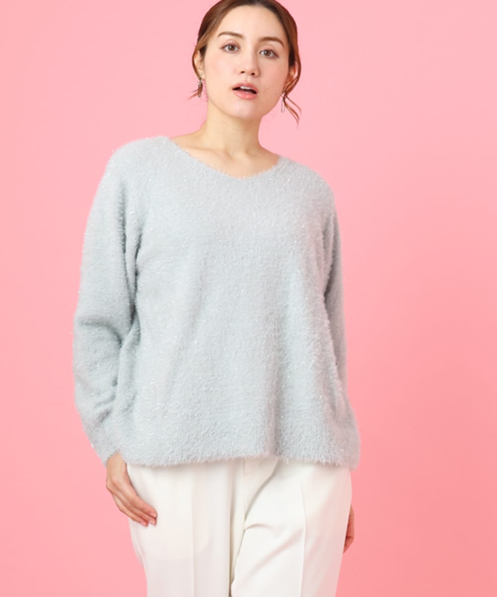 ネックはスッキリ見えするVネック仕様で、柔らかな印象を演出
