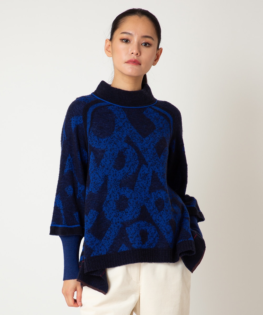 ロゴジャカードニットプルオーバー。ゆったりとしたシルエットに切り替えのレイヤード風の袖が大人可愛いアクセントに。リブ使いやイレギュラーなサイドシルエットもポイント。カジュアルにさらっと合わせてもこなれ感ある雰囲気に仕上げてくれるおすすめのアイテムです。