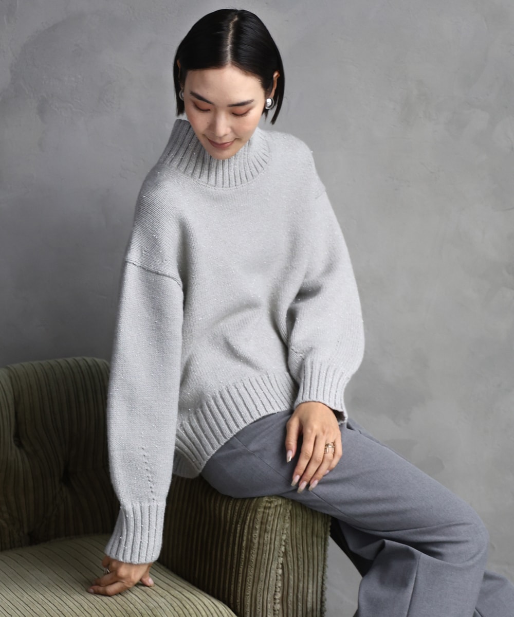 小さいビーズが全体的に散りばめられ上品なきらめきが美しいニット。程よいボリューム感で