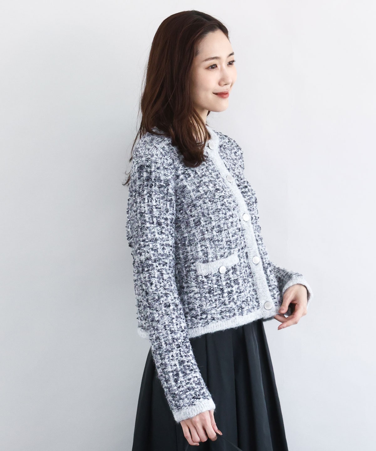 さらに、華やかさをプラスするツイードニットジャケットとのセットアップもおすすめ。