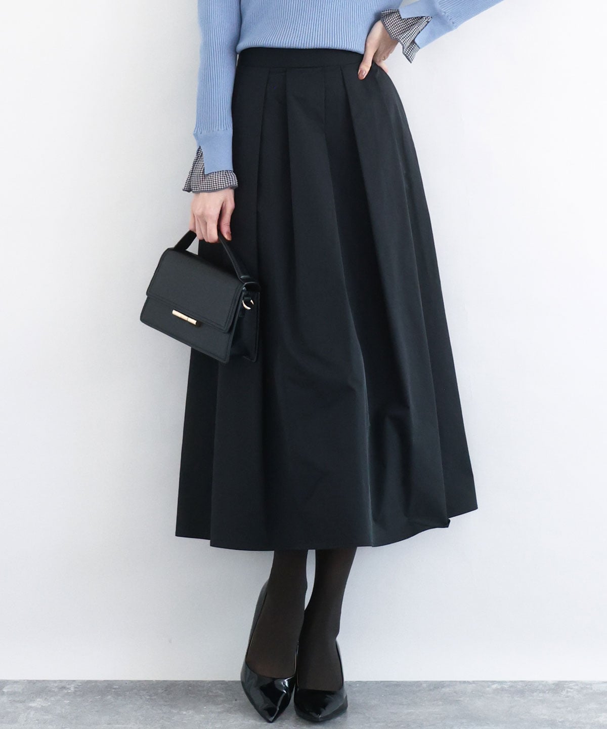 さらに、メモリータフタのタックフレアスカートは、すっきりとしたシルエットと軽やかな素材感で、上品さと快適さを兼ね備えています。