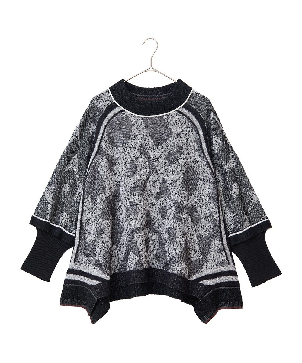 ニットはとてもデザインが凝っていて、とてもステキです。軽くてエアリーで暖かいです。両サイドのヘムご下がっていて、袖にも変化がつけてあります。前身頃と後ろ身頃の柄の変化も面白いです。