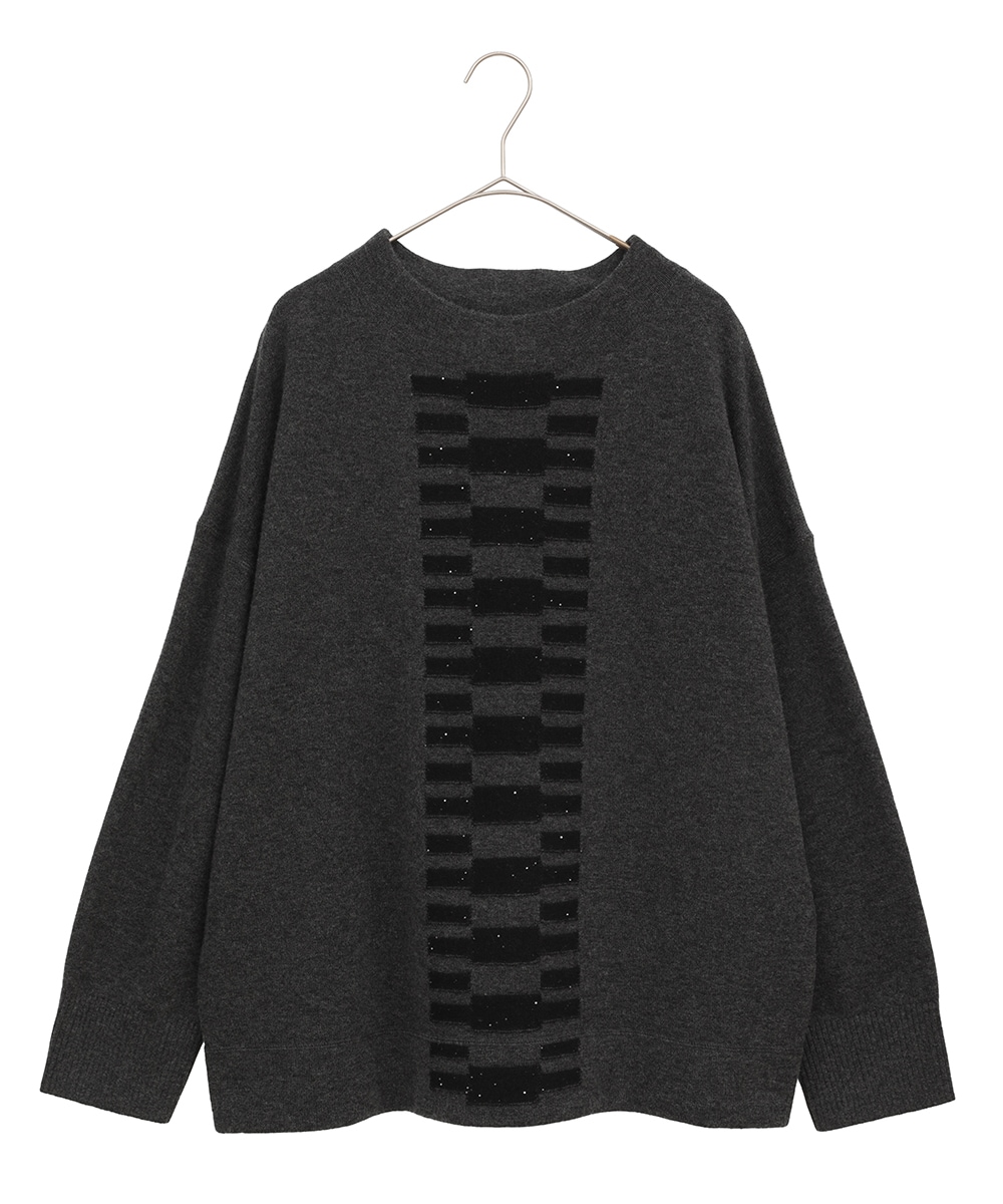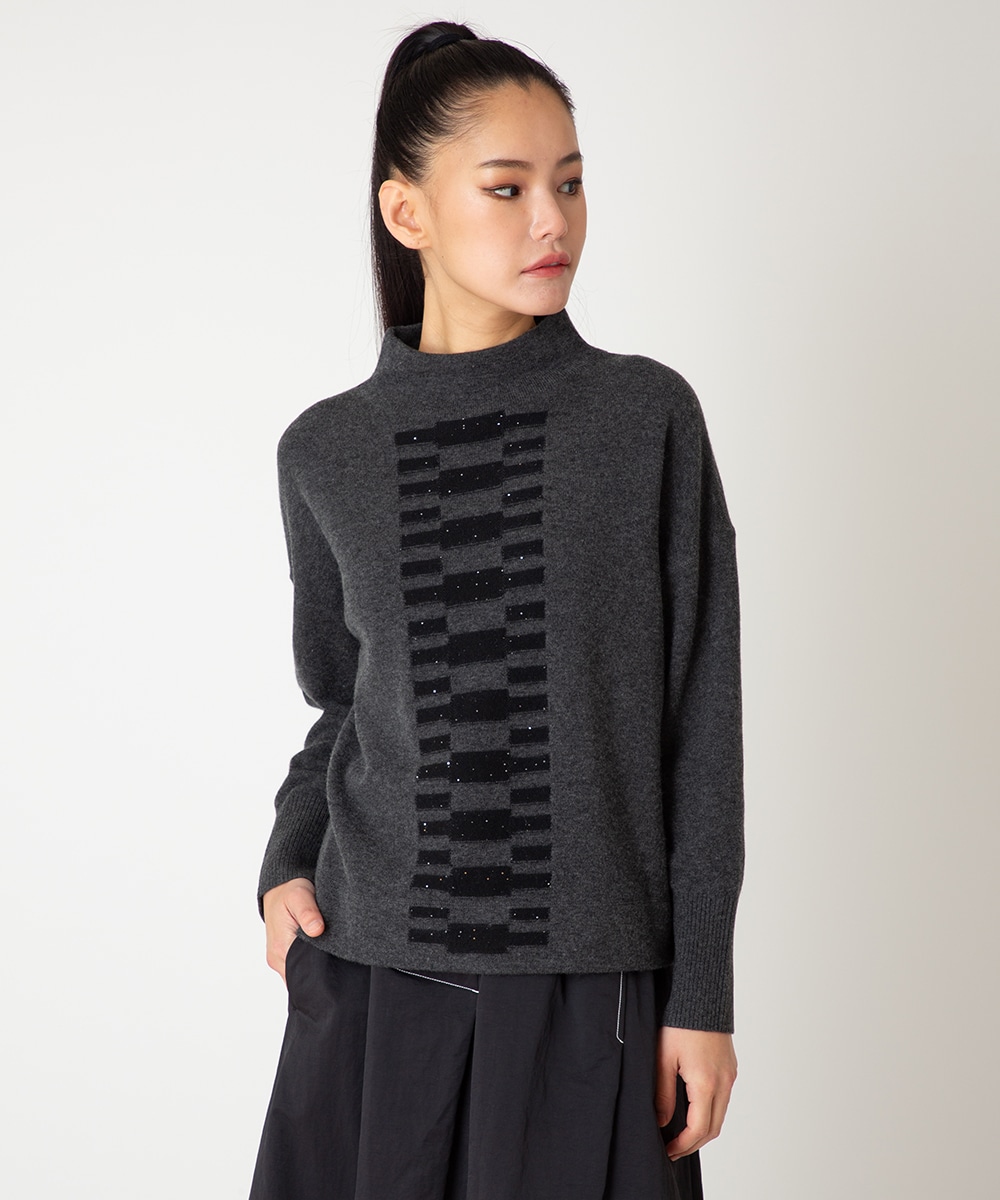 また、幾何柄モチーフスパンコールニットプルオーバーは、さりげなく光るスパンコールと幾何柄の配色で、コーデにアクセントをプラス。