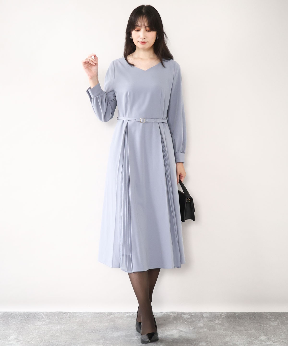 動くたびに優雅に揺れるプリーツが、きちんと感と華やかさを演出します。