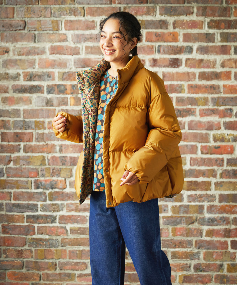 短めのダウンですが首元が暖かいです。袖口もゴムが入っているので風も入りにくいです。しかも小さく畳めるのでホコモモラのロゴ入りの袋がついてます。インナーはコットン100%で肌触りが良く着心地が良いです。衿端のかぎ針刺繍と袖口の2段のメロウがポイントです。ワンピースは全面に贅沢に刺繍があります。衿の開きが深いので、どんな身長の人にも合わせやすいです。
