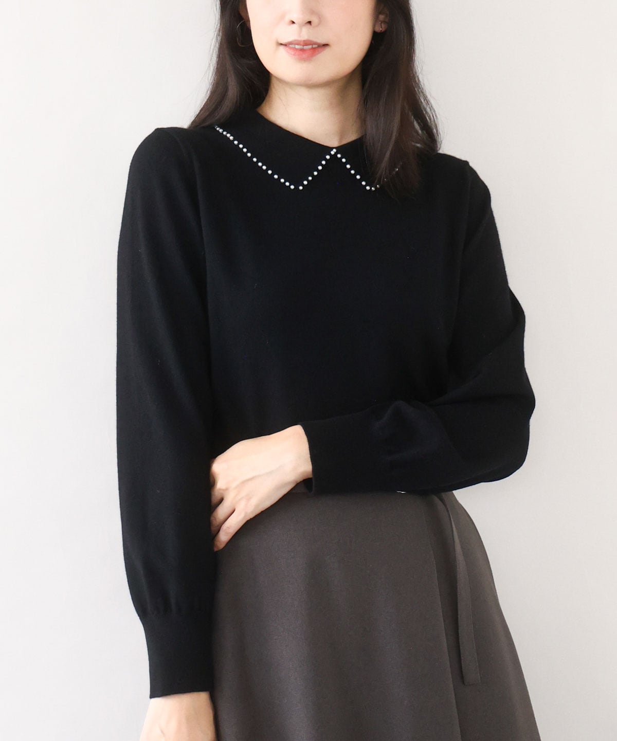 クラシカルな衿付きニットは、パール調ビーズのアクセントが上品さを引き立て、柔らかいニット素材で女性らしい印象を演出します。