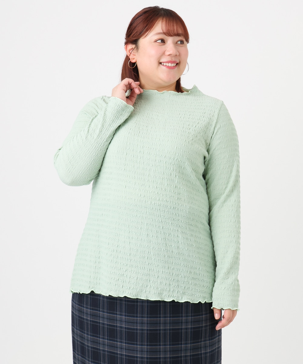 ハイネックデザインとポコポコとした表面感が、上品かつ華やかな印象を与え、女子会コーデやちょっとしたお出かけにも最適。