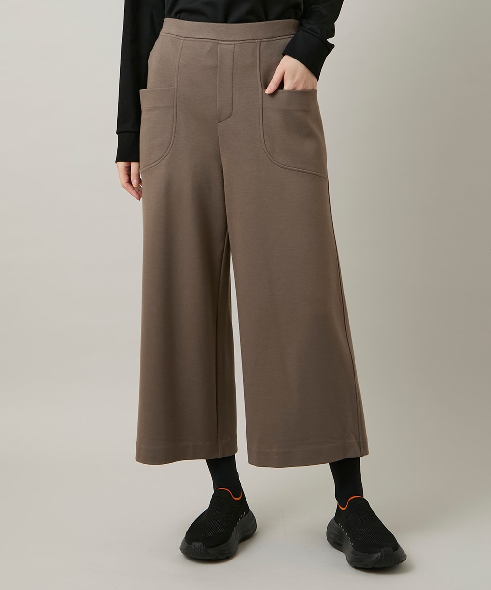 パンツは滑らかなポンチ素材の穿き心地のよい一本です。ウエスト総ゴムなのも嬉しいポイントです。美しいシルエットラインと穿き心地を両立したお勧めのパンツです。