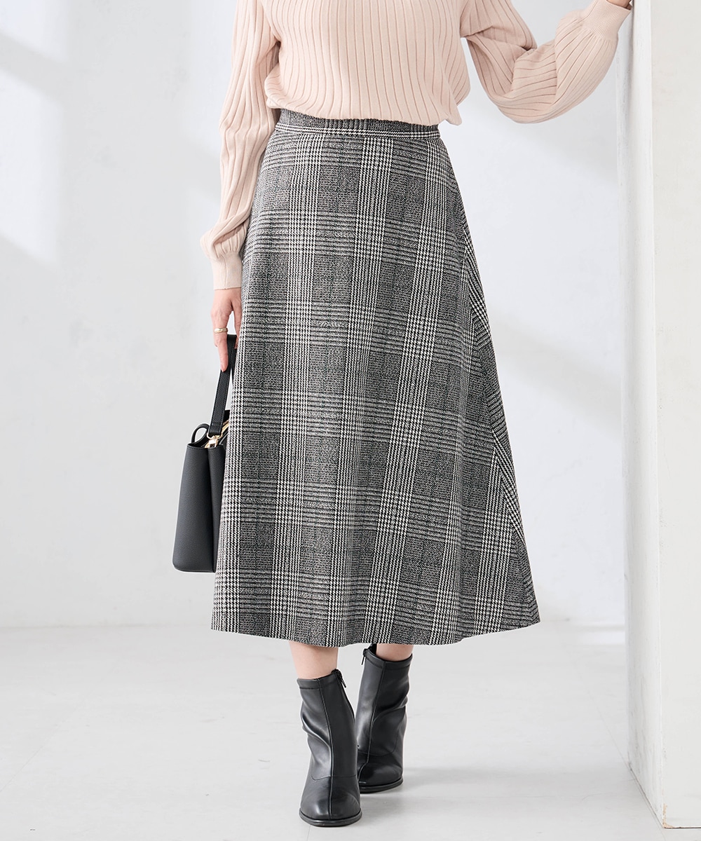 ボトムのスカートはあたたかい生地のAラインスカートでキレイ見えします。グレンチェックが大人っぽい印象になります。低身長さんでも長すぎることなく履いて頂けます。