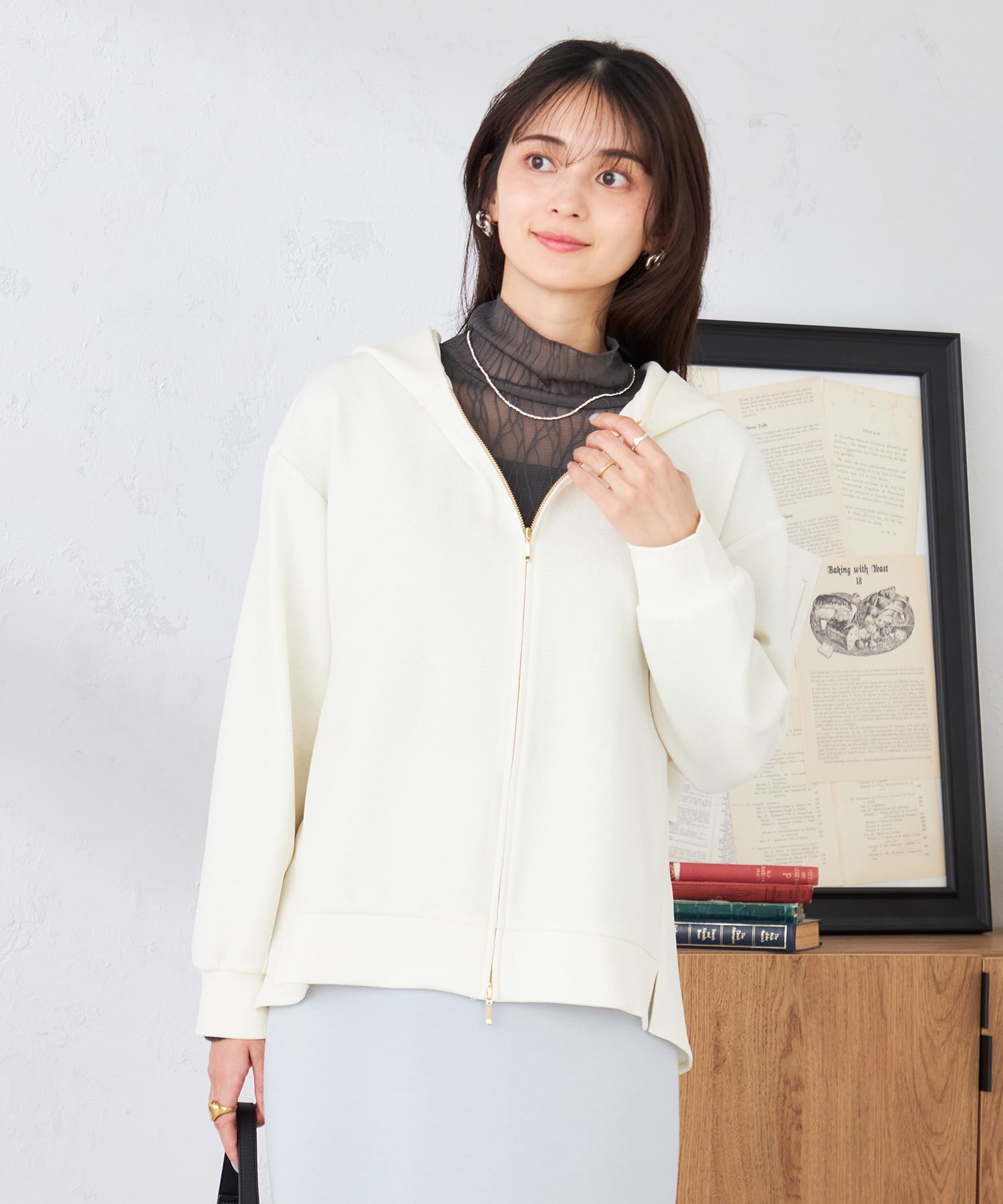 きれいな表面感の素材なので、パーカーなのにカジュアルすぎず大人も着こなしやすい一枚