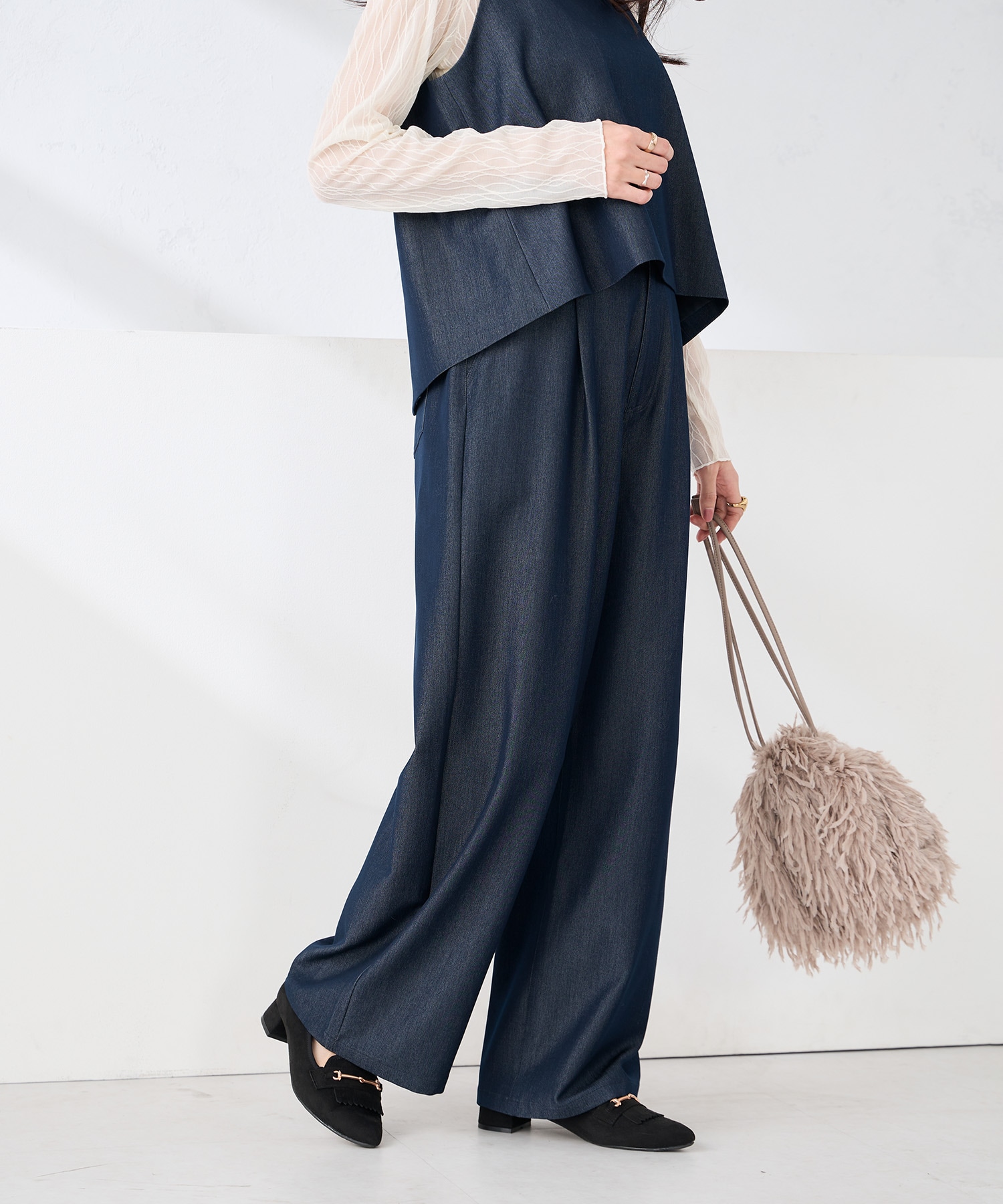 デニム見えのきれいめ素材なので、ブラウス・ニットなどトップス問わず着こなしを楽しめます