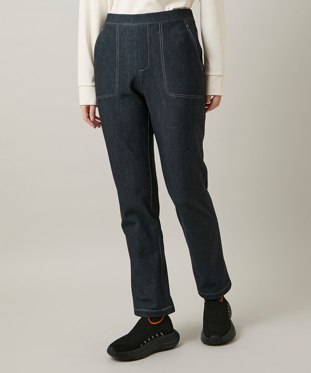 暖かくスッキリと!裏起毛の3Dデニムスリムパンツは、程よいハリ感と体型カバー力で、着痩せ効果も期待できる優秀アイテム。ストレッチ素材とウエスト総ゴムの楽チンボトムです。