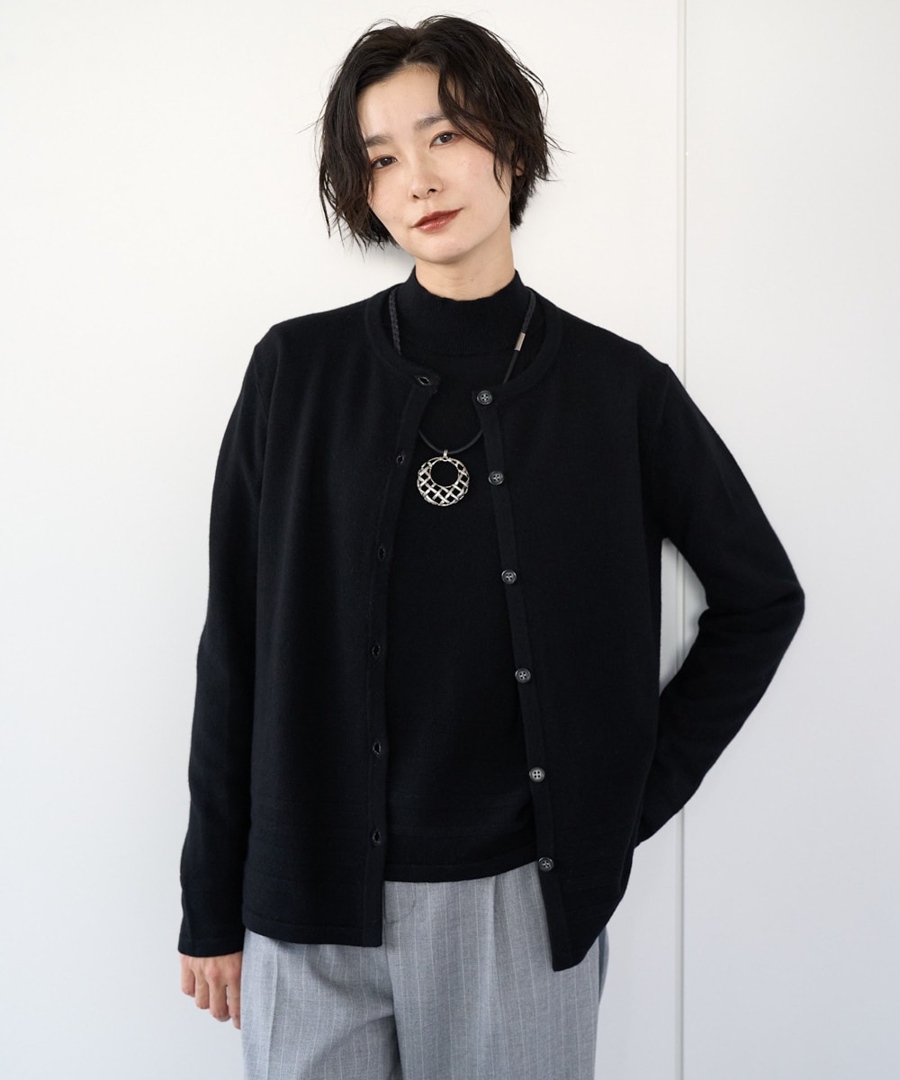 カットソーは幾何柄ジャガードで柔らかい印象を演出し、絶妙な高さの衿とシンプルなシルエットが着こなしの幅を広げます。