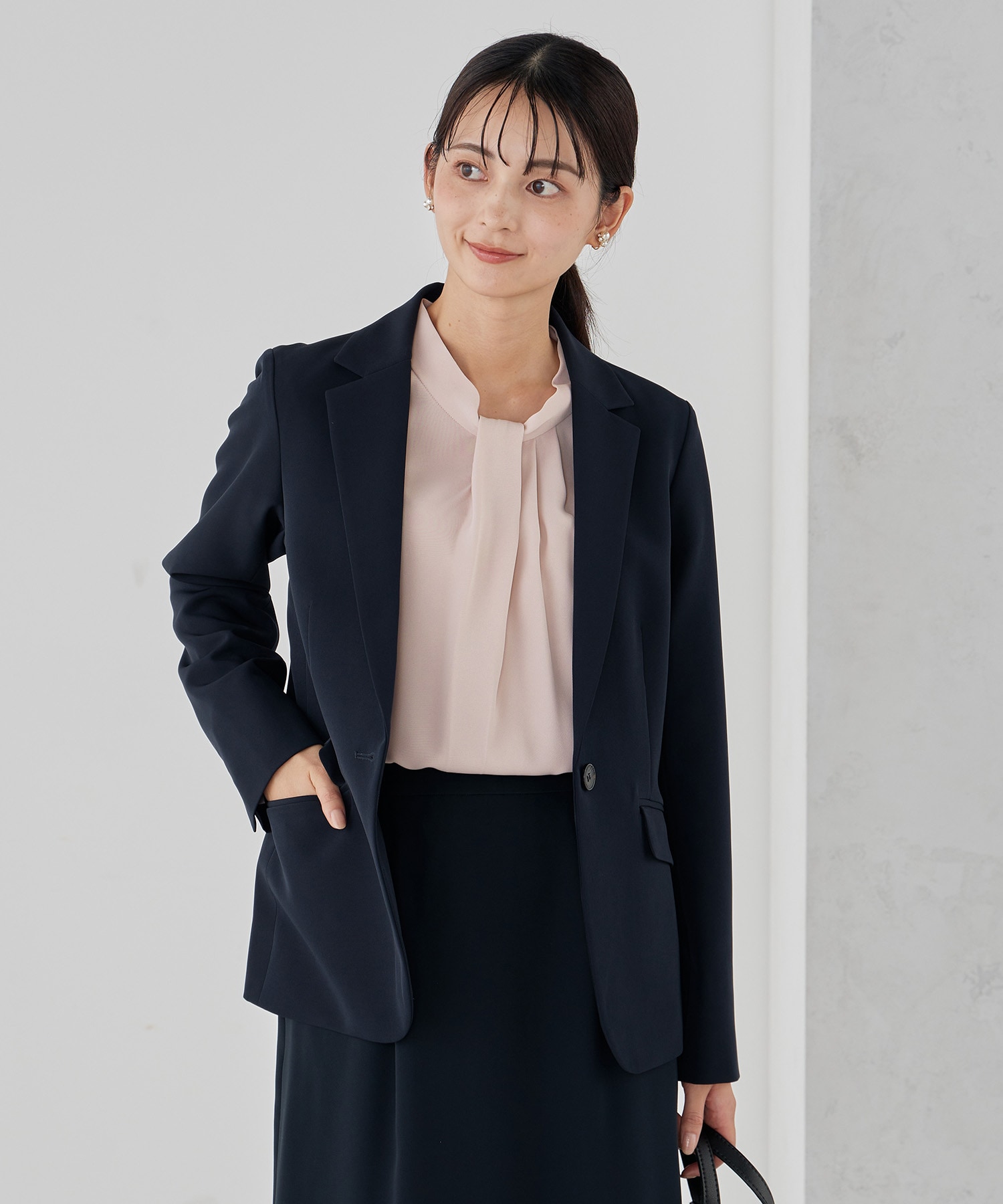 ※同素材のボトムやスカート、ワンピースとのセットアップスタイルで、きちんとした印象になります。