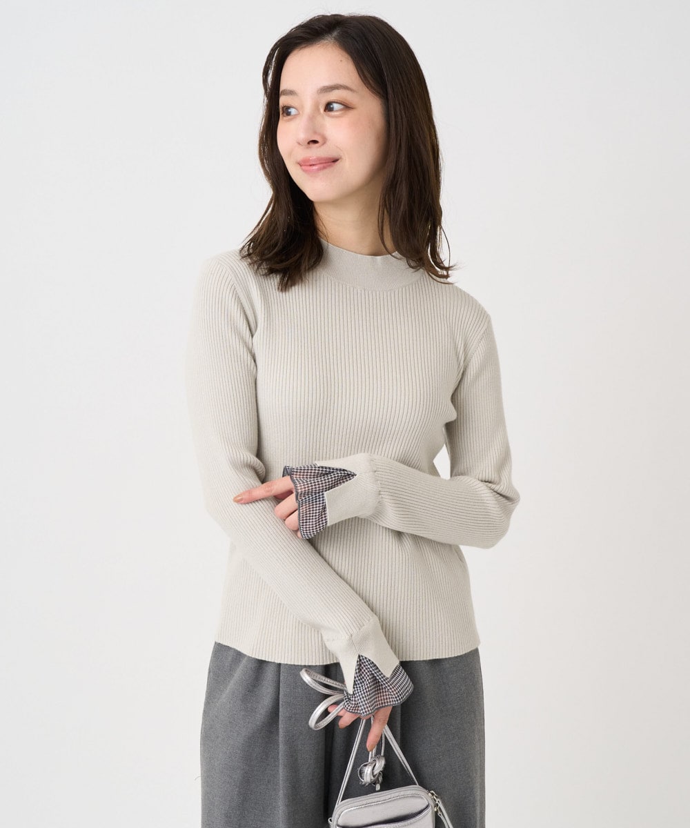 【小さいサイズ】千鳥格子柄シフォンレイヤード風ハイゲージニット/洗える
